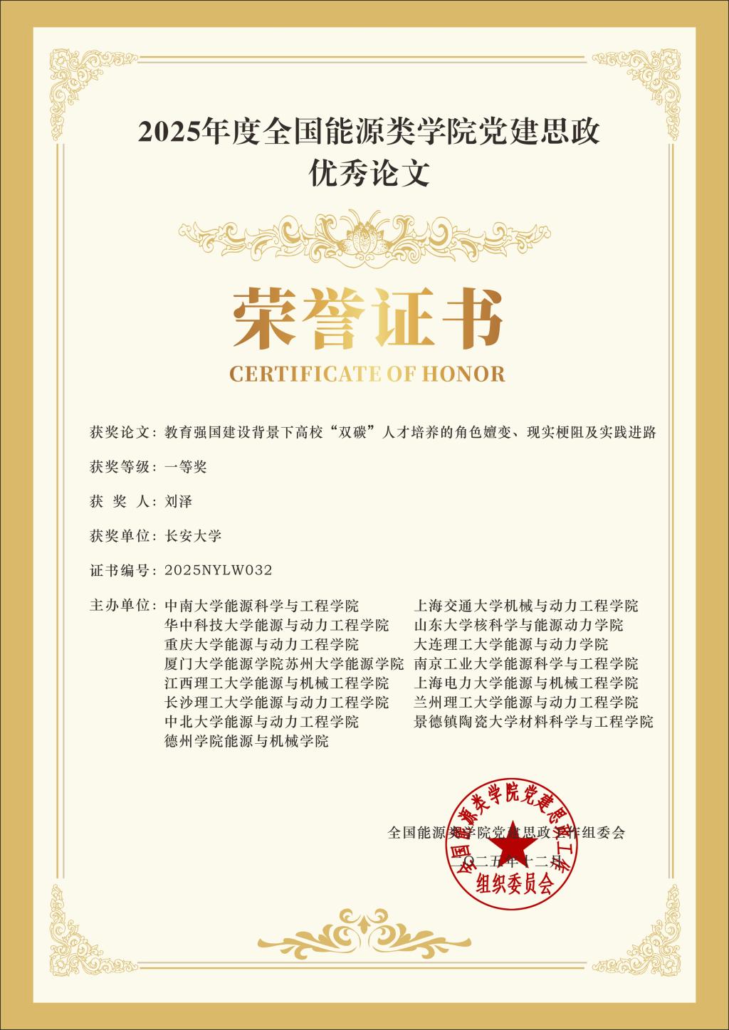 近日,2025年度全国能源类学院党建思政优秀论文评选结果正式揭晓。我院学生工作办公室副主任刘泽撰写的《教育强国建设背景下高校“双碳”人才培养的角色嬗变、现实梗阻及实践进路》一文荣获一等奖。