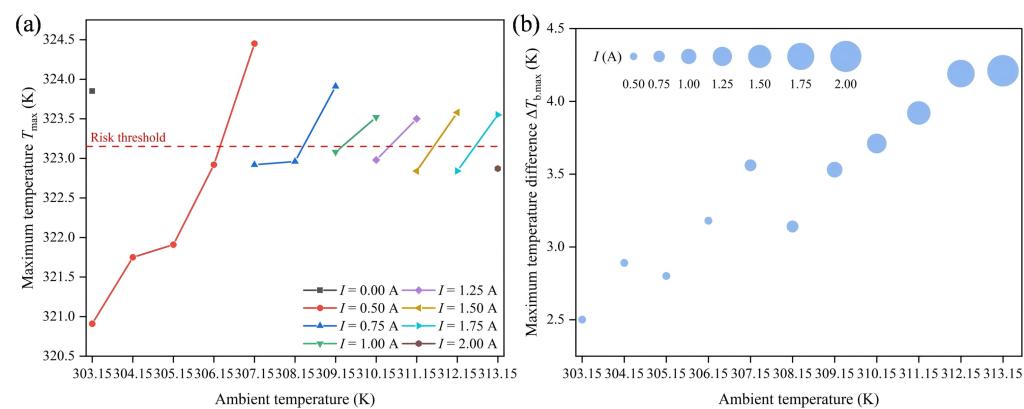 (a)不同放电倍率和环境温度下的最高电池温度和(b)最大电池温差