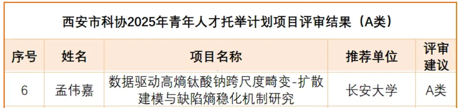 “青年人才托举计划”是西安市科协为支持优秀青年科技工作者独立开展科研工作、培养高层次科技创新人才而设立的重要项目。该项目旨在选拔具有发展潜力的青年科技人才,助力其在科研领域快速成长,为西安市的科技创新和产业发展贡献力量。孟伟嘉老师在锂离子电池以及先进储能电池(钠/钾离子电池、水系锌离子电池等)研究取得了突出成果,其研究内容紧密结合国家能源需求和地方产业发展,具有重要的学术价值和应用前景。