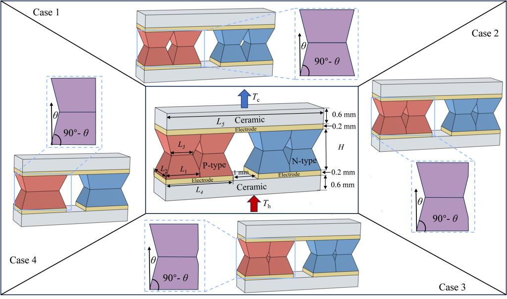 目前,大多数研究仍主要聚焦于热电腿在垂直方向上的结构优化,而横向几何变化对耦合热电传输性能的影响则相对关注不足。为弥补这一研究空白,本文创新性地提出了一种具有中空结构的横向双X型热电发电机(TEG)结构。通过构建热-电-机械耦合数值模型,系统分析了空心度、拔模角度和热电腿高度等关键参数对TEG性能的影响。结果表明,与具有相同热电材料体积的传统TEG相比,当负载电阻超过20 mΩ时,增加空心度可显著提高输出功率和效率。适度的拔模角会增强温度梯度,而过大的拔模角会导致低负载条件下的性能下降。具体来说,在θ = 30°时,在情况1中,最大效率提高达到52.27%,但在低负载下观察到24.85%的降低。此外,热电腿高度对性能有明显的影响:较低的高度(H = 1.2 mm)有利于功率输出(提高10.68%),而较高的结构(H = 2.0 mm)可提高效率(高达25.80%)。值得注意的是,几何变化显着影响热应力分布。这项工作为开发兼具高性能和机械可靠性的TEG提供了一种新的设计策略。