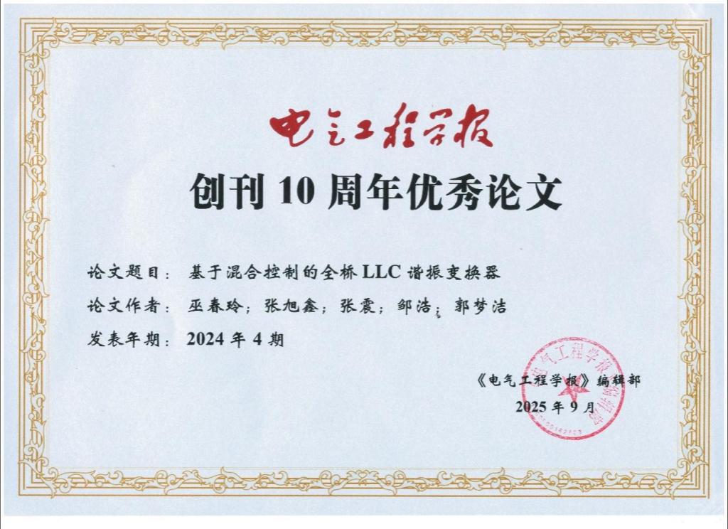 长安大学能源与电气工程学院张震、巫春玲副教授团队在《电气工程学报》上发表了题为《基于混合控制的全桥LLC谐振变换器》的研究论文,被评为《电气工程学报》创刊10周年优秀论文,该奖项从《电气工程学报》2015-2024年间发表的1050篇论文中评选出60篇优秀论文,巫春玲副教授为论文第一作者,张震副教授为论文通讯作者,唯一署名单位为长安大学能源与电气工程学院。