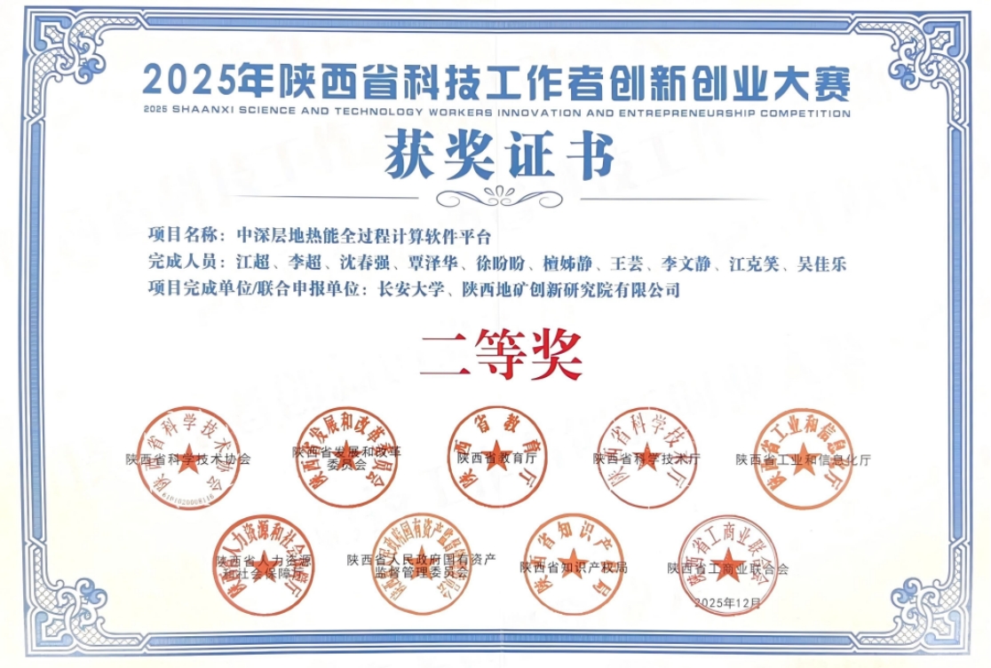2025年11月,陕西省科技工作者创新创业大赛在西安举办。能电学院青年教师李超作为第二参与人,与建筑工程学院江超老师主持完成的《中深层地热能全过程计算软件平台》荣获二等奖。