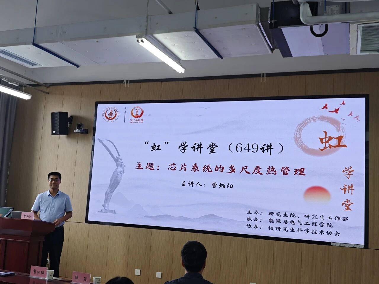 9月6日下午,由研究生院、研究生工作部主办,能源与电气工程学院承办,校研究生科学技术协会协办的“虹”学讲堂第649讲在北校区能源与电气工程学院612教室顺利举办。清华大学曹炳阳教授作了题为“芯片系统的多尺度热管理”的报告,能电学院陈昊院长主持,相关学院共60余名师生参加讲座。