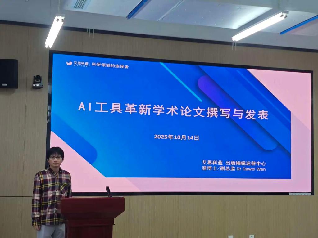 为积极响应国家关于人工智能赋能教育发展的战略部署,引导师生科学、高效地运用智能工具,10月14日,我院成功举办了以“AI工具革新学术论文撰写与发表”为主题的讲座。本次讲座特邀艾思科蓝出版编辑部温大尉总监担任主讲,吸引了众多师生踊跃参与。