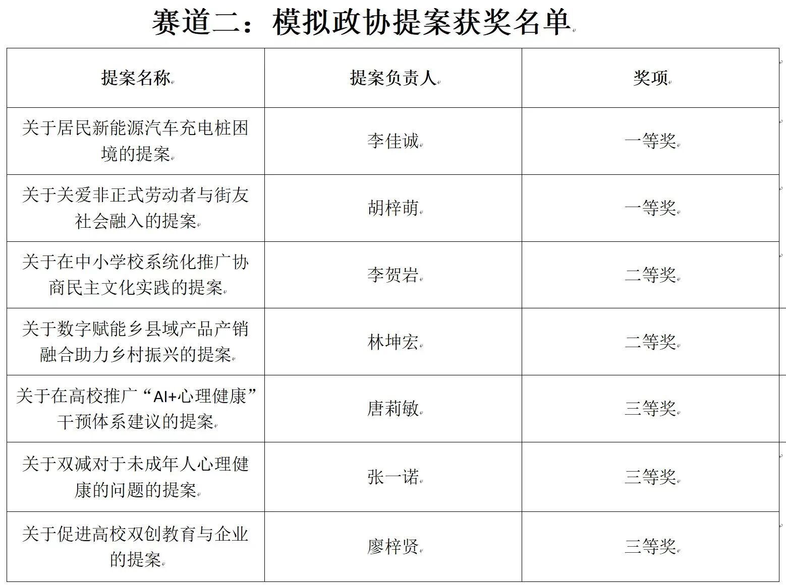 本次大赛共征集提案23份,其中赛道一“我的长大我做主”校园提案13份,赛道二模拟政协提案10份。同学们有的聚焦学校管理、教学、生活等具体场景,有的聚焦社会民生与公共事务等社会热点,提出自己独到的见解,都各有侧重又同样出色,彰显了同学们立足当下解决实际问题的能力。