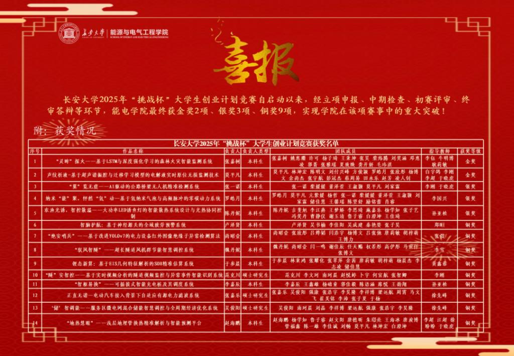 长安大学2025年“挑战杯”大学生创业计划竞赛自启动以来,经立项申报、中期检查、初赛评审、终审答辩等环节,能电学院最终获金奖2项、银奖3项、铜奖9项,实现学院在该项赛事中的重大突破!